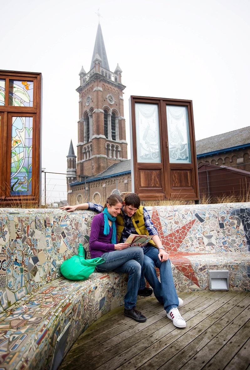 Het dakterras is echt de kers op de taart van de tentoonstelling. Je kan er genieten van het prachtige uitzicht op een bank die werd gemaakt uit honderden tegeltjes die uit verschillende Blankenbergse Belle Epoque huizen komen. Je vindt er ook enkele prachtige authentieke art deco glasramen die zeker je aandacht waard zijn.
